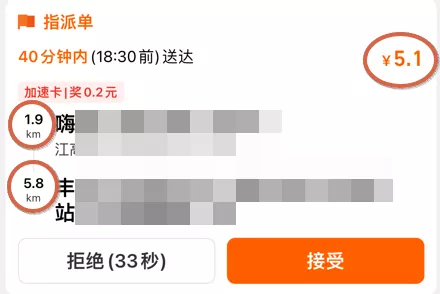 像这些:系统指派一个取餐2公里,送餐6公里,限时40分钟的订单,价格5元,你做还是不做?每天有12次拒绝订单的机会,如果拒绝12次之后,就得下线,没得再跑。这等于是逼骑手跑这种“垃圾单”,如果按平均时速15公里来跑,来回刚好30分钟,半小时赚5元。再塞一下车,等一下红灯,时薪绝对低于10元。你不会认为这8公里都没红绿灯吧?我算你以平台允许的最高速骑行(40公里),并且全程没路口,没红灯,还不塞车,还也不用转弯,你的时薪也将仅有20元,也仍然低于法定最低工资。就是这样的订单,你全不做,平台会认为“你有旷工态度”,于是逼你下线。而重新上线的要求是啥?据说是“打开自动接单功能,无论系统派什么单(无论单价如何),你都自动接受”。