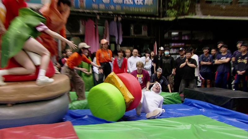 接下来的游戏是基隆营养三明治,3男3女组队参赛,挑战者分别从左右方出发,跳往中间平台,中途落地的人须回到起点出发,6个人都站到中间平台后,由其一参赛者跪在中间平台最顶端,将手中的旗子插进吊在空中的容器内,秒数短者组别获胜。