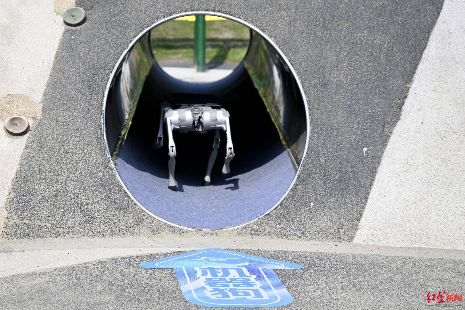 无人机穿越空中“隧道”,机器狗翻越“山坡”随行,引擎轰鸣中,有的无人机在障碍阻挡中栽了跟头,有的成功登顶,稳稳降落在机器狗背上。