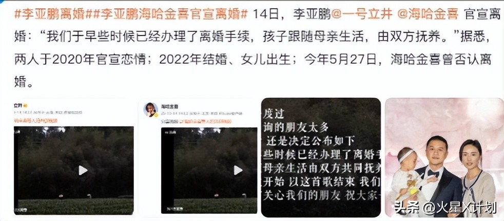 2025年10月14日,李亚鹏与海哈金喜共同发布视频,宣布已办理离婚手续,孩子跟随母亲生活,由双方共同抚养。