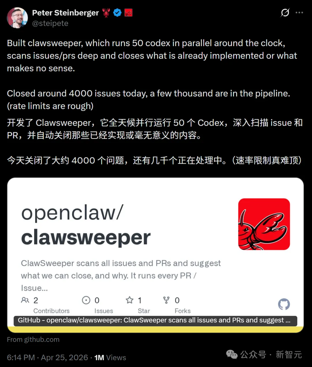 OpenClaw之父一夜屠光5000 Issue新智元