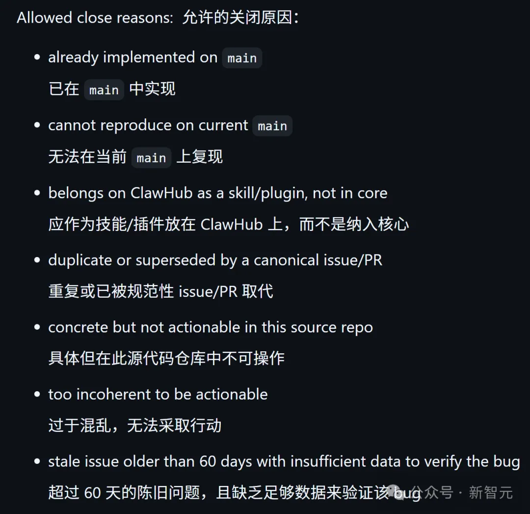 它只在以下7种情况下才会关闭一个Issue::已经在 main 实现、当前 main 无法复现、应归属 ClawHub 的 skill/plugin 而非 core、重复或已被更权威条目取代、在该仓库内具体但不可执行、内容过于混乱不可执行、以及超过 60 天且缺少足够数据验证 bug。
