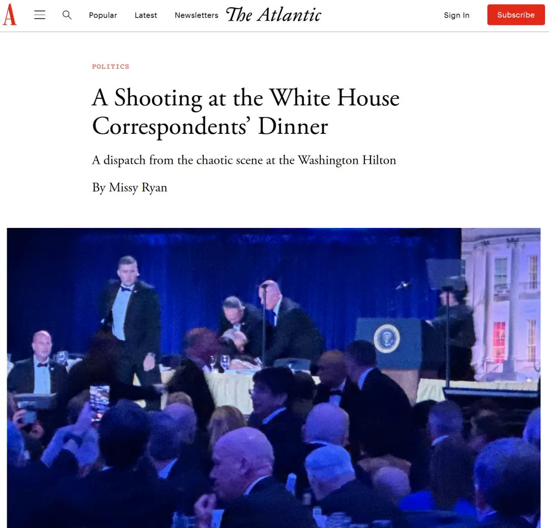 一切发生得措手不及,还没等我们反应过来,人已经钻到桌子底下了。前一秒,一支军乐队正列队走出华盛顿希尔顿酒店那宽敞的宴会厅;包括我在内的二十多位《大西洋月刊》同事,以及数百名记者和政府官员,都穿着最体面的(或是借来的)晚礼服,正准备享用盘中的芝麻菜沙拉。