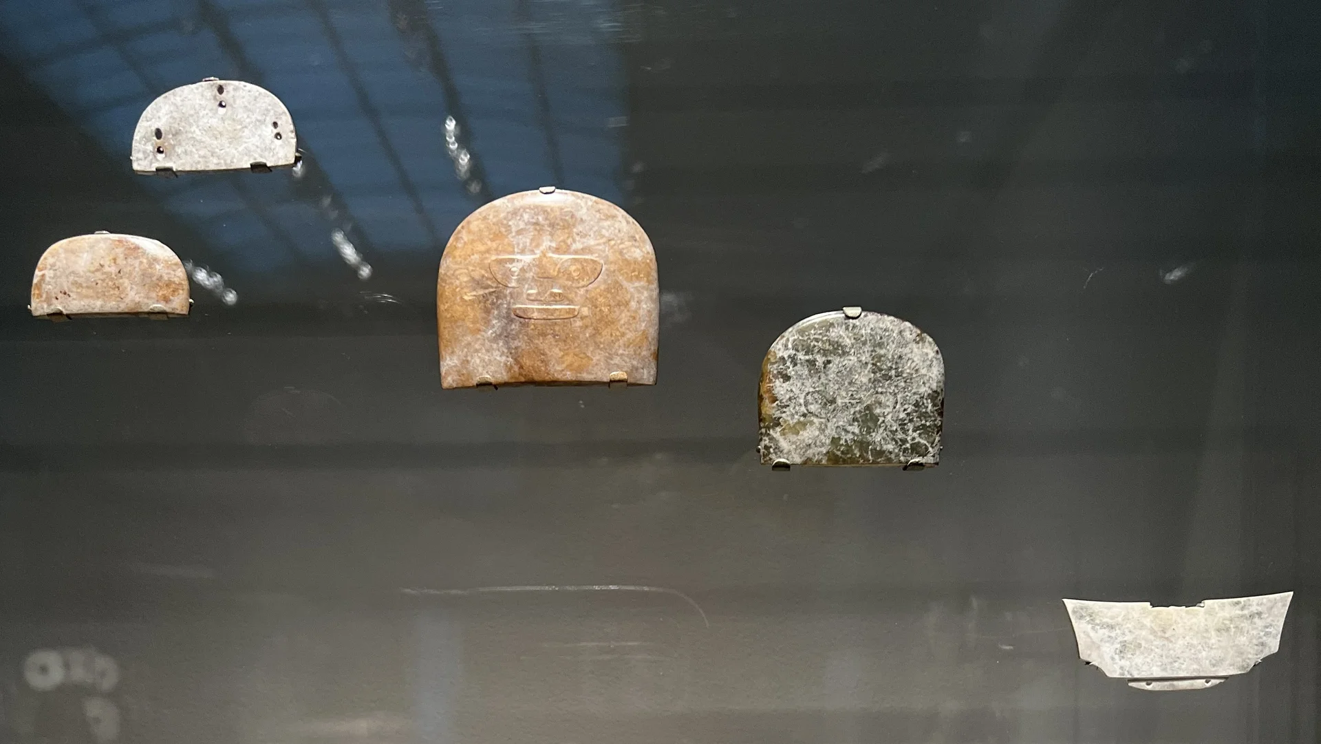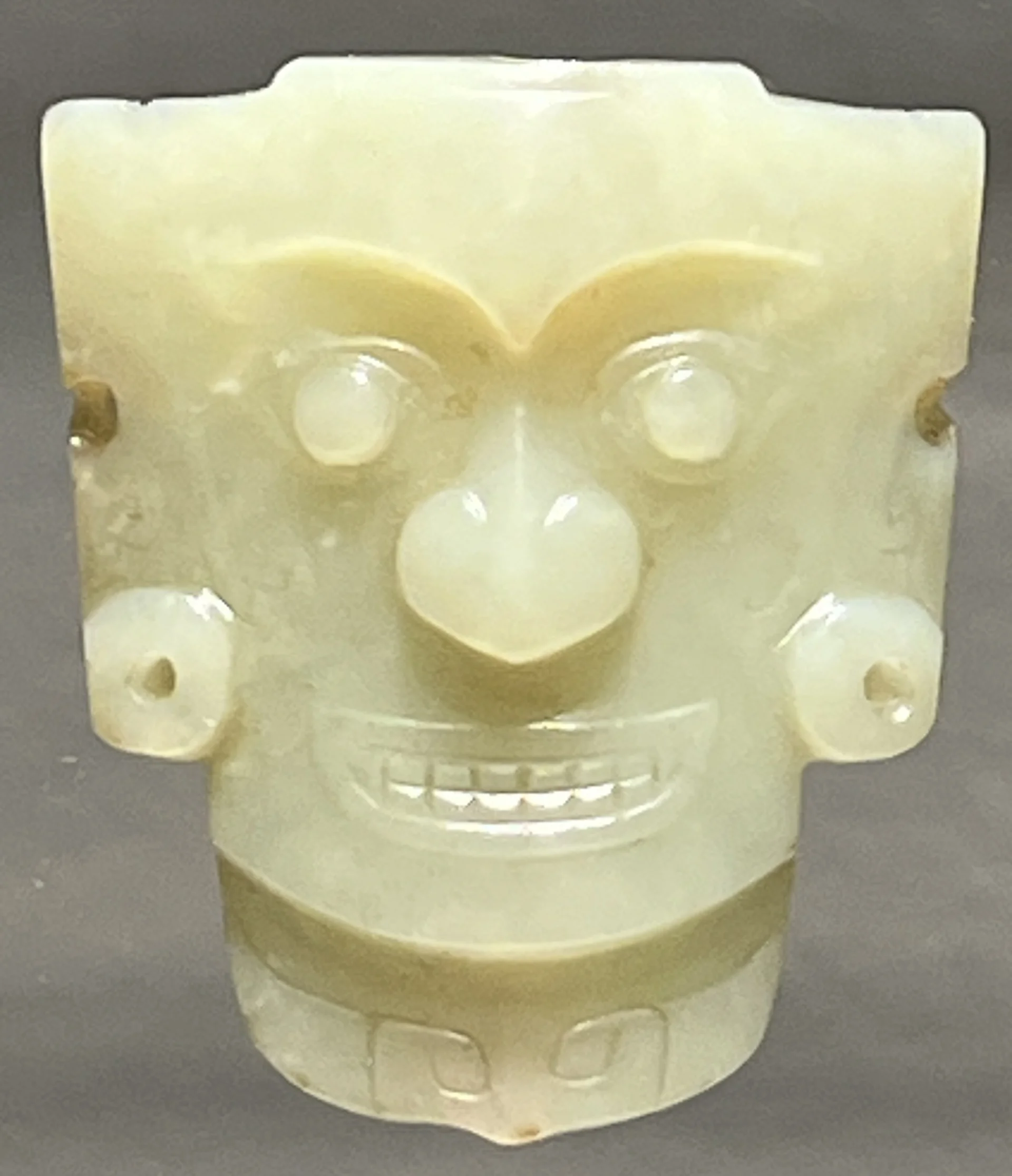 在墓葬中发现的特殊手镯、佩饰和头饰,必定在良渚人生活中具有某种仪式性的功能。带有“面具”纹样的图案常见于为仪式和葬礼制作的器物上。这里展示的例子强调了突出的巨大眼睛和狭长的嘴部,这些浮雕效果是通过费力地磨去周围背景而形成的。像这样顶部呈圆弧形的装饰玉牌,常在墓葬中的头骨附近被发现。其背面的成对小孔表明,这些玉牌曾被缝缀在皮革或织物制成的头饰上,由逝者佩戴。