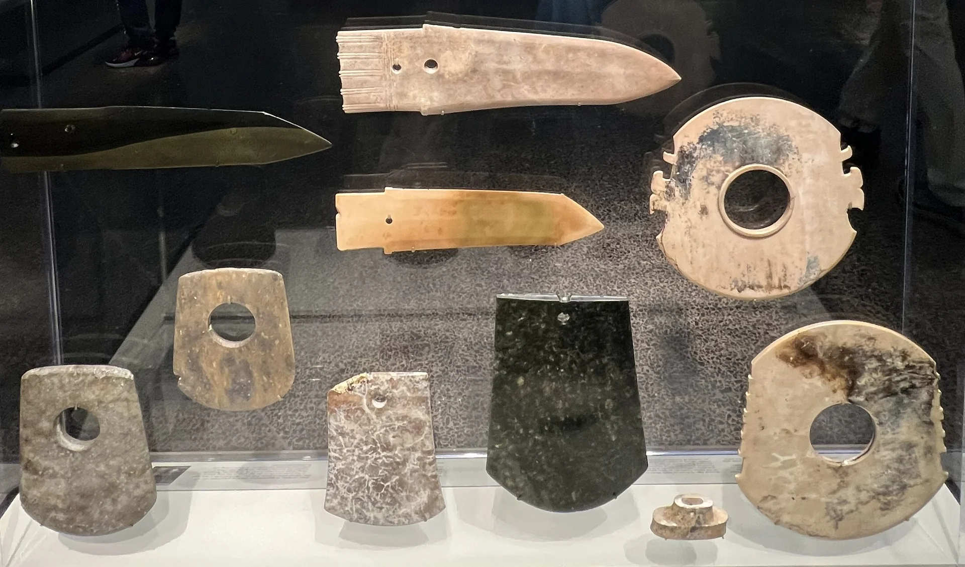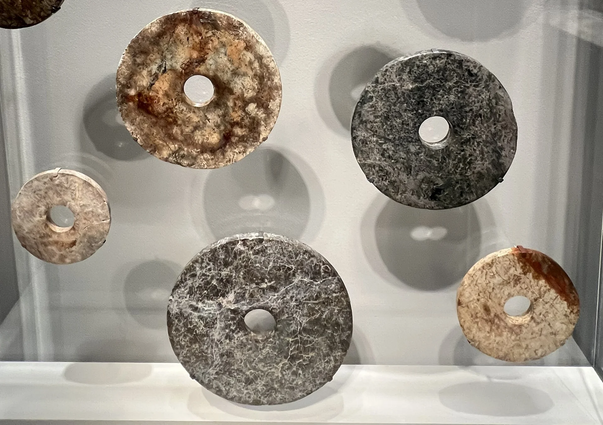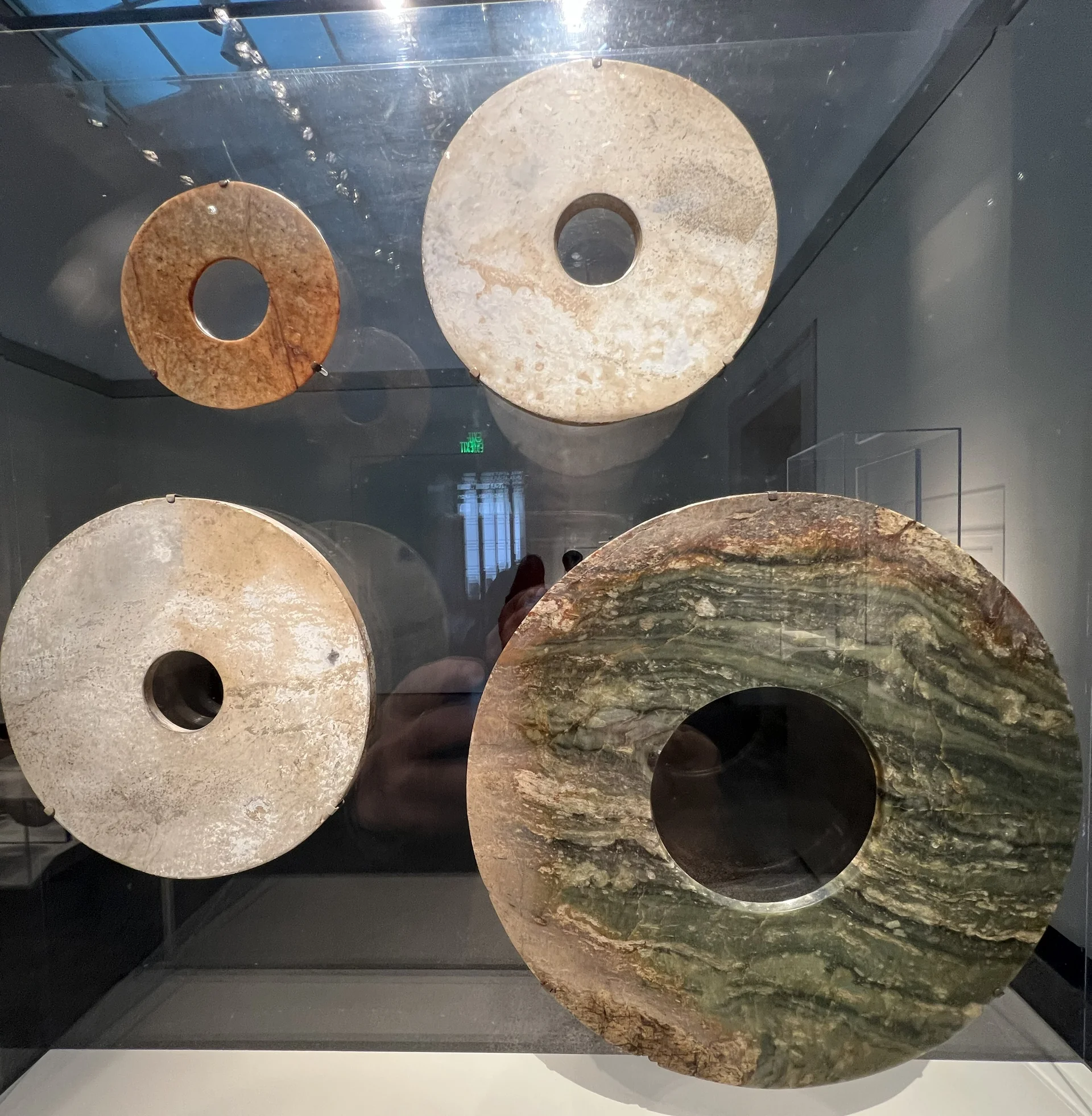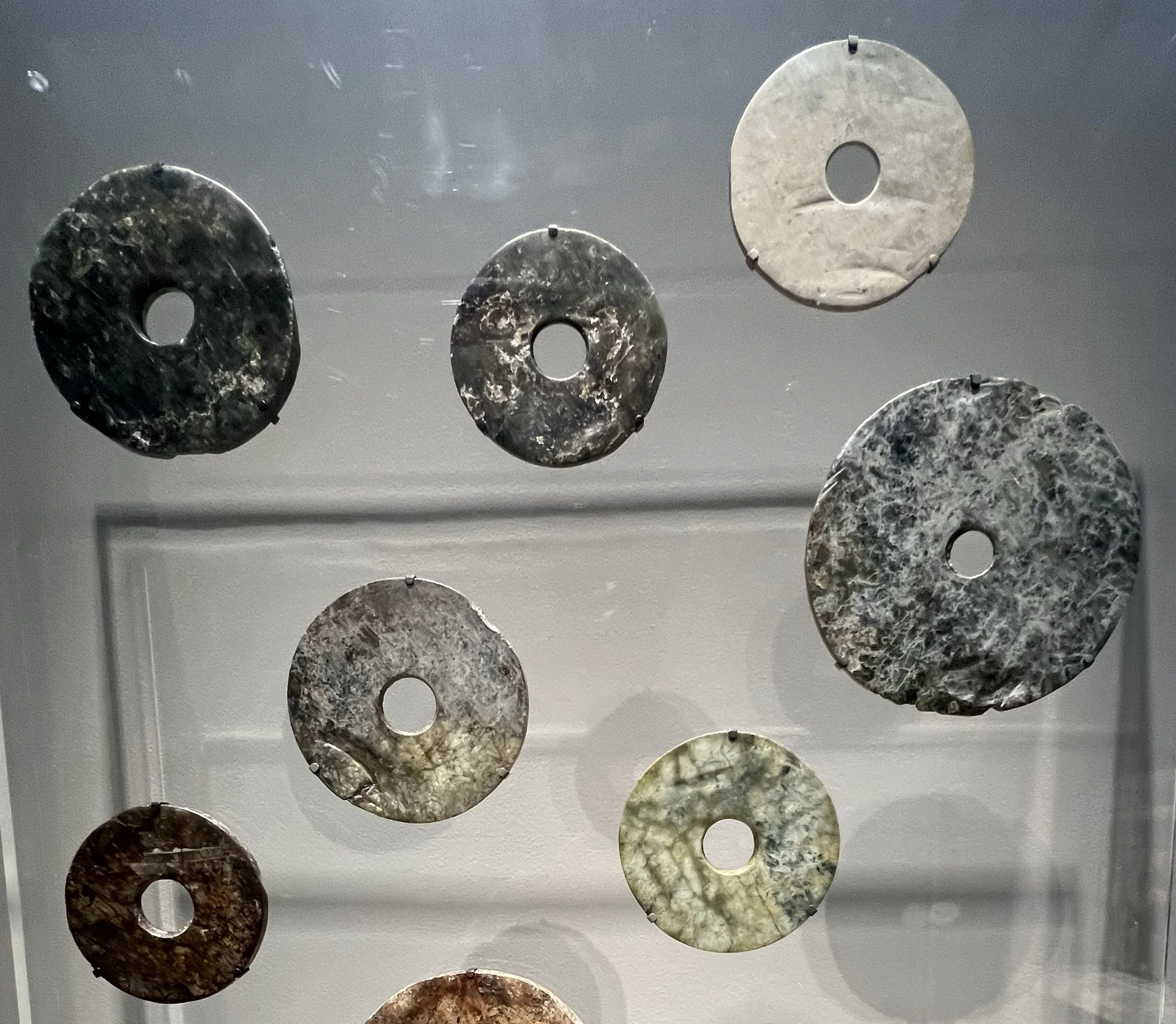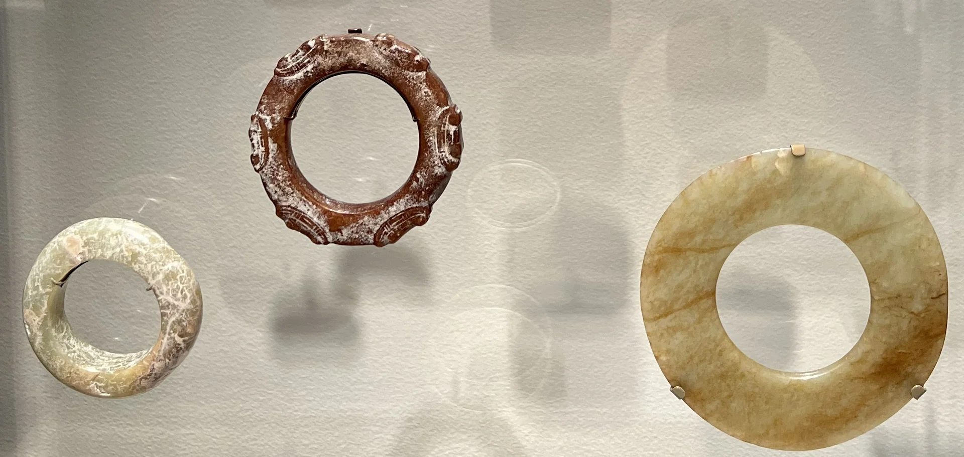 在这里,最大的一件玉璧仍保留着软玉原石外层的“皮壳”。那两件偏白色的圆盘为蛇纹石制成,这是一种较为柔软的石材,在中国西南的四川地区使用。其他玉璧体量较小,这表明到了青铜时代早期,人们已经遗忘了这些圆形玉器在良渚墓葬中的原始礼仪用途。