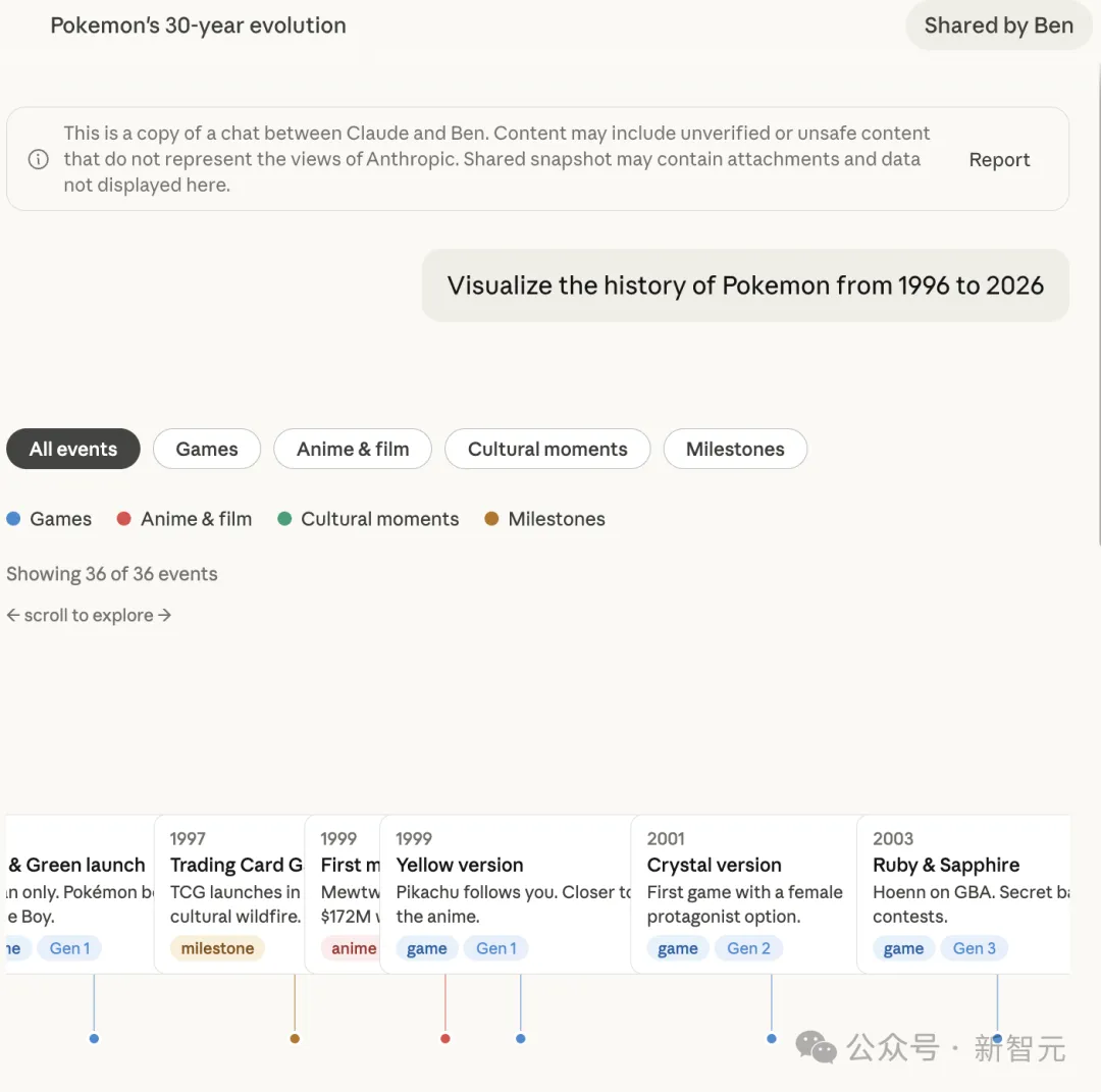 另一个测试是让它做宝可梦系列的视觉历史,带有游戏、影视、文化事件的分类筛选器,完成度相当高。