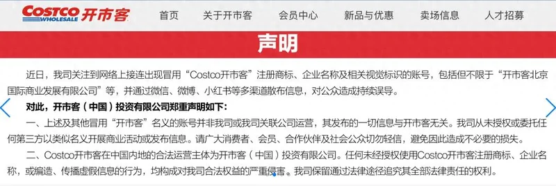 这一消息很快引发围观讨论,开市客中国官网发布声明称,Costco开市客在中国内地的合法运营主体为开市客(中国)投资有限公司(以下简称“开市客中国”)。任何未经授权使用Costco开市客注册商标、企业名称,或编造、传播虚假信息的行为均构成对我司合法权益的严重侵害。