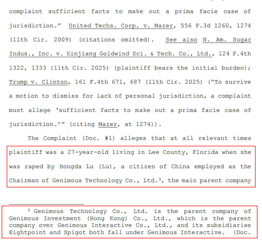 蓝鲸新闻通过相关渠道拿到上述裁定文件后发现,文件中披露了一名居住在佛罗里达的27岁女性,指控遭到名为Hongda Lu的中国公民强奸,并指出,Hongda Lu为Genimous Technology Co., Ltd.董事长。