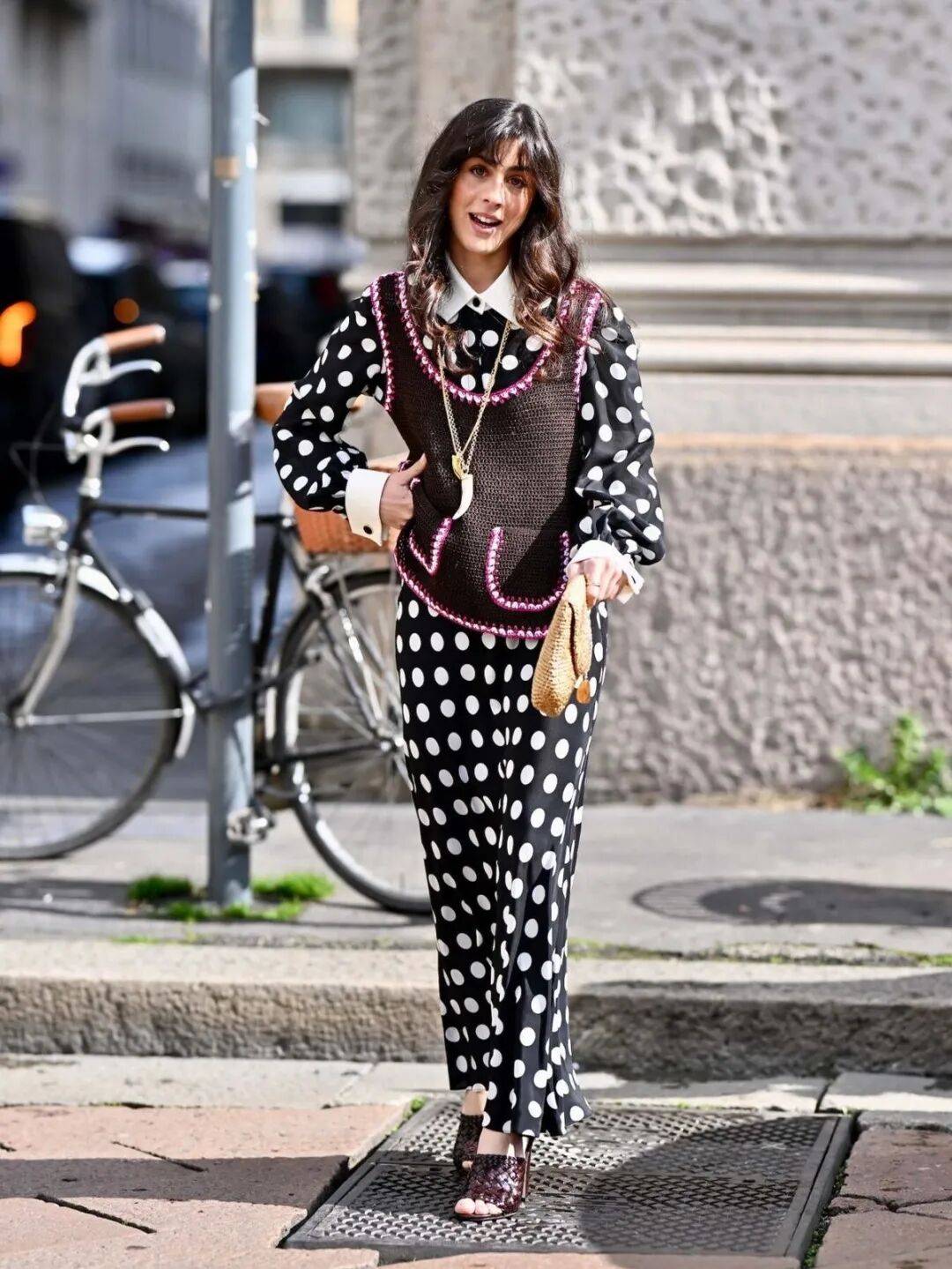 运动感夹克上可以出现波点,阔腿裤上的波点也可以很大胆,可爱的圆点让走动时的轮廓更加生动。