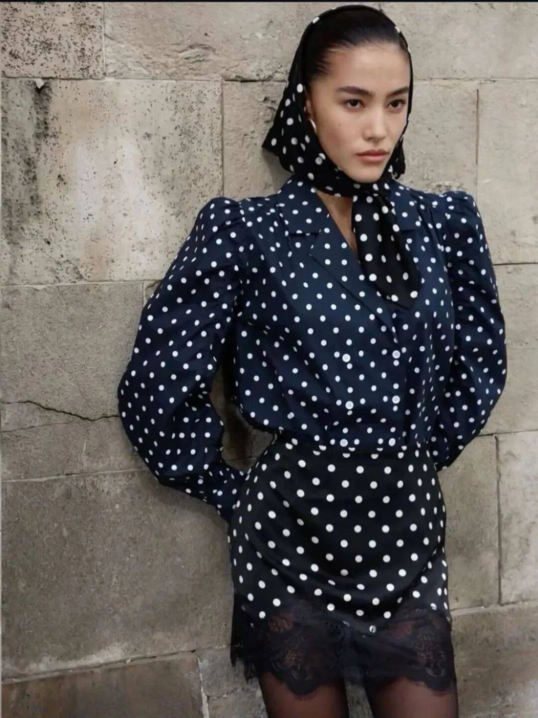 这种细腻变化让波点在复古之上多了灵动。搭配时不需费力,一件波点蕾丝上衣配直筒牛仔裤,或一条波点薄纱半裙搭纯色针织衫,就能塑造灵动又复古的风格。