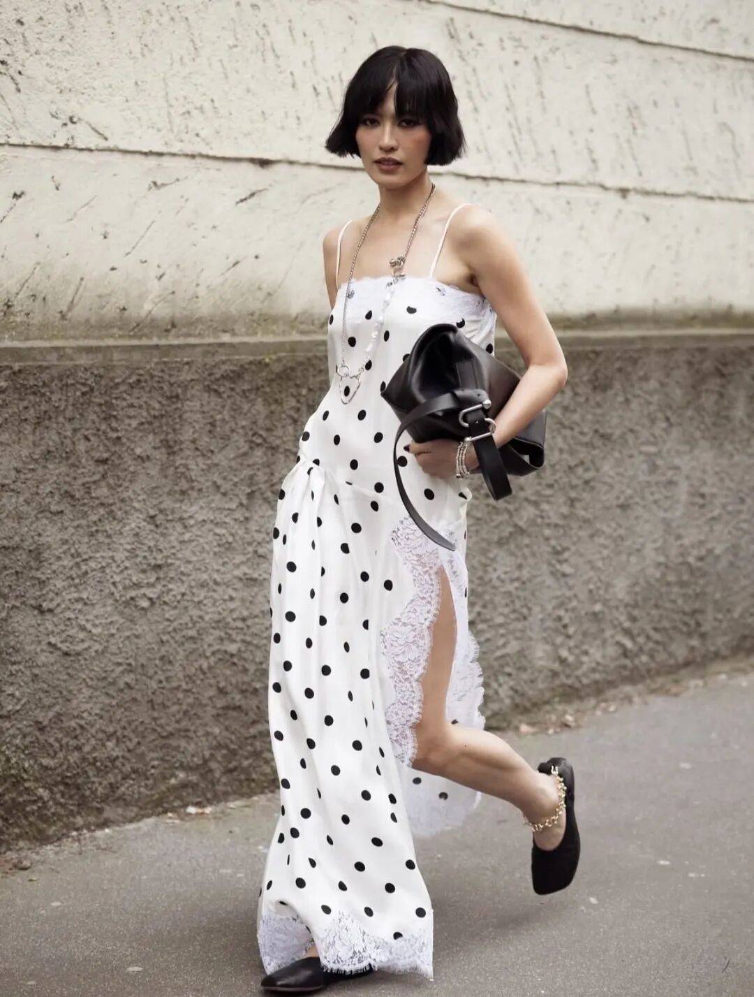 波点的大小和密度也更为灵动。过去均匀排布的大圆点依然经典,但今年更流行错落有致的细密波点,打破秩序之后更为灵动。