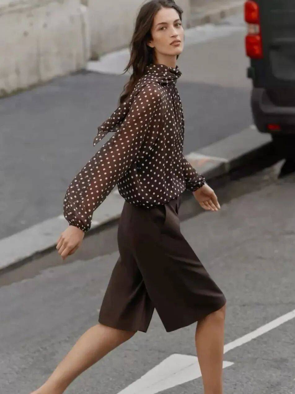 咖色波点带着内敛沉静,像午后一杯拿铁。好比一件咖色底配米白色波点的衬衫,比纯色多了耐看层次。