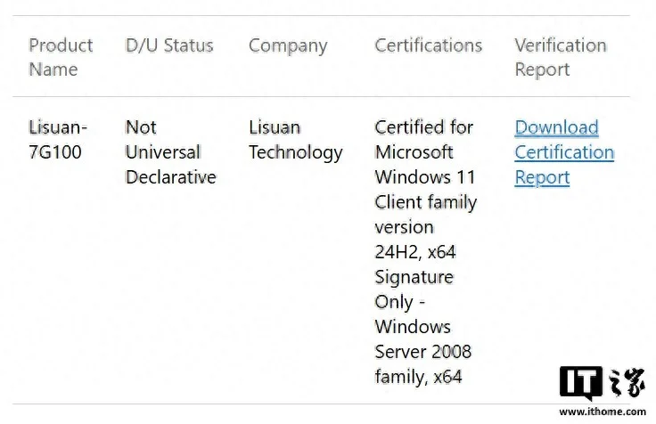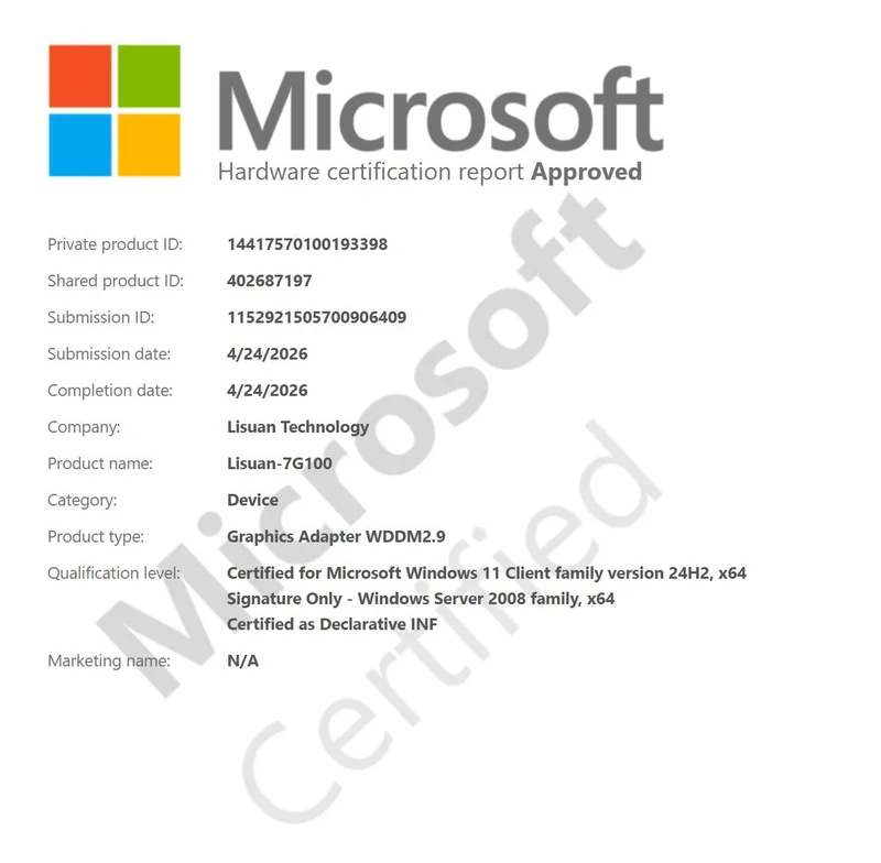 据微软官网数据,砺算科技 7G100 现已通过微软 WHQL 认证。成为国内首家、全球第四家通过此认证的 GPU 公司。