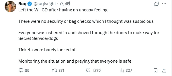 她的朋友则发帖说:离开 WHCD(白宫记者晚宴)后有一种不安的感觉,没有安检或包检,我觉得这很可疑,每个人都被催促着进入,并被推过门,以便为特勤局/警犬让路,门票几乎没有被检查,正在关注局势,并祈祷每个人都安全。