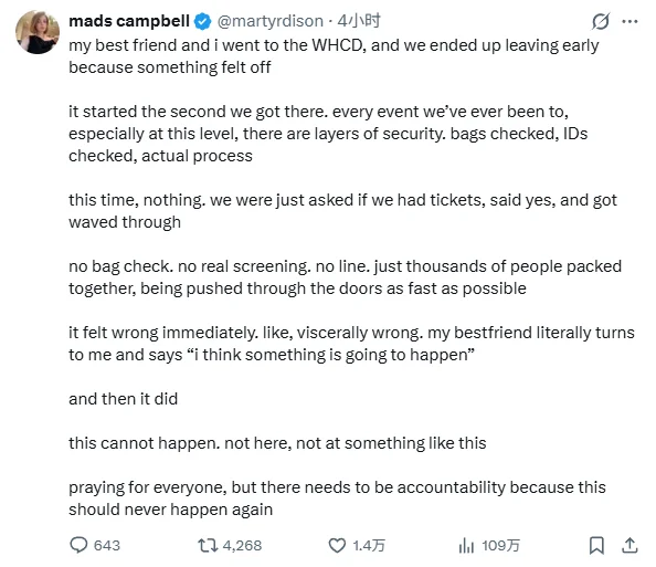 她说:“一切从我们到达的那一刻就开始了。我们参加过的每一个活动,尤其是这种级别的活动,都有多层安保措施。检查包,检查身份证,真正的流程。这次,什么都没有。我们只是被问有没有票,说有,然后就被挥手放行了。
