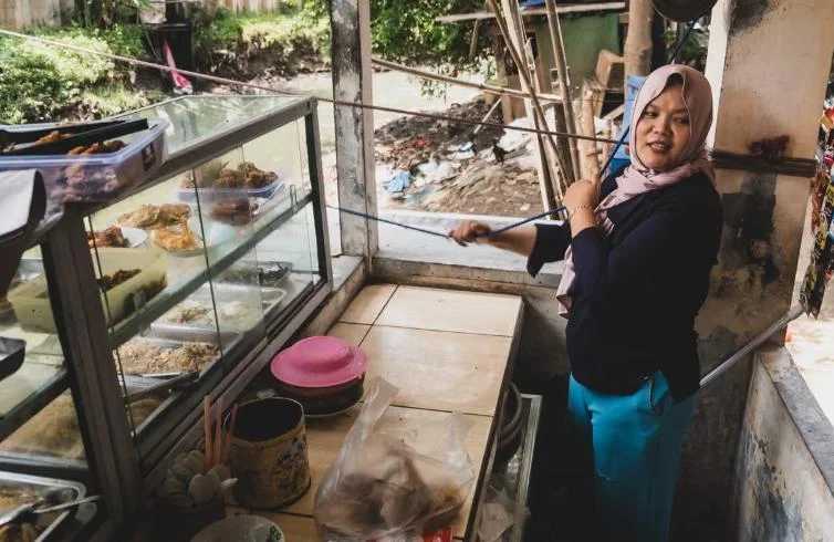 45岁的妮宁·穆萨利玛在昆宁甘商业区的一条河边经营着一家传统小餐馆。她的顾客是对岸写字楼里的上班族。