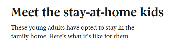 “父母从不催促我搬出去,也没有宵禁,很尊重我的自由。除了一个 30 多岁的朋友,其他朋友也都还住家里。但有时还是会觉得自己像没长大一样。”