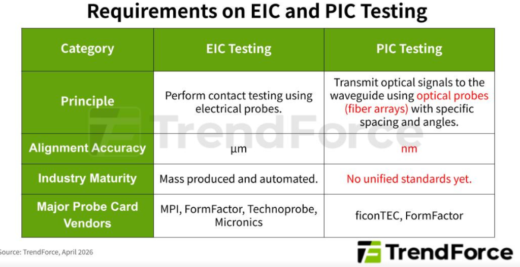 “EIC测试与PIC测试对比表”——对比测试原理、对准精度、行业成熟度、主要探针卡厂商四个维度,图源:TrendForce,下同