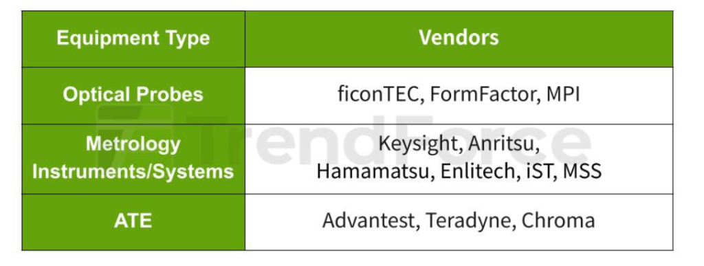 CPO测试设备市场正在成形。从设备商格局来看,传统自动测试设备巨头Advantest和Teradyne正通过并购与合作快速补齐光学能力,Keysight、Chroma、Enlitech等则在各自细分领域占据位置。整个供应链从光学探针、计量仪器到自动测试设备,正在围绕CPO测试需求重新组织。