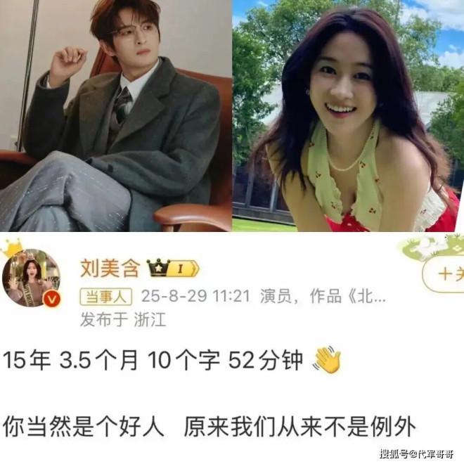 这段跨越多年的友情,在2025年迎来了疑似“升华”与“落幕”的转折。当年七夕,刘美含发布了一条意味深长的微博,“15年 3.5个月 10个字 52分钟 你当然是个好人 原来我们从来不是例外”,这条隐晦的文案瞬间引爆全网,网友纷纷解码其中深意----“15年”对应两人相识的时长,“3.5个月”被推测为恋情持续时间,“10个字”疑似刘美含此前调侃张远自拍“磨皮开太大”的评论,而“你当然是个好人”“原来我们从来不是例外”两句,更是直接对应张远的两首歌曲歌词,种种线索都指向两人疑似开启了一段短暂的恋情,又悄然分手。