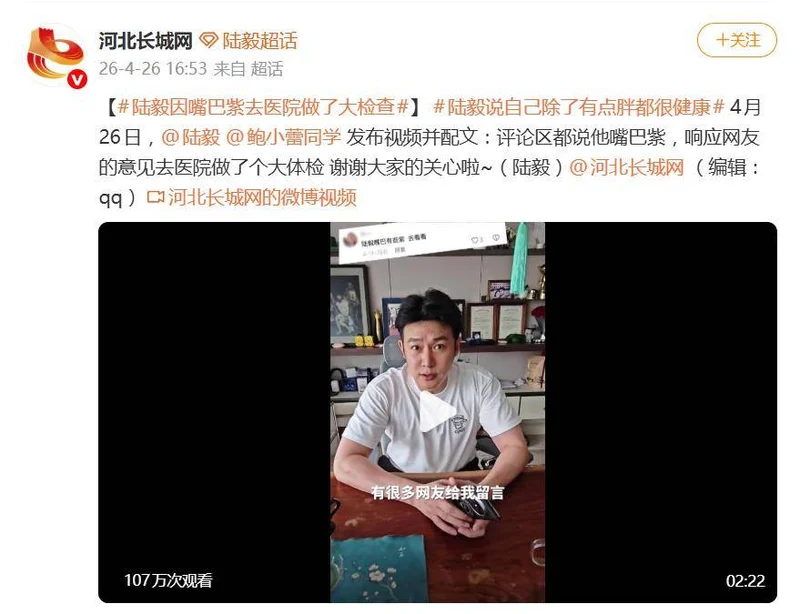 最近,演员陆毅因为“嘴唇发紫”这事儿,直接冲上了热搜。4月26日,他本人发了一条视频,配文写得明明白白:“评论区都说我嘴巴紫,响应网友的意见去医院做了个大体检,谢谢大家的关心啦~”