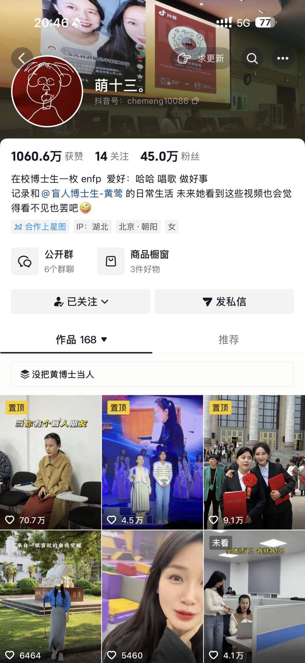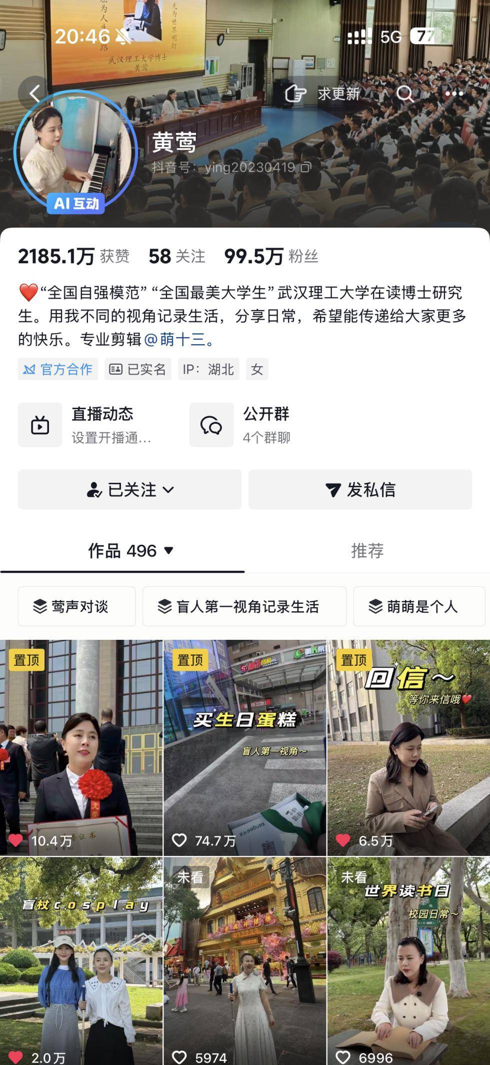 黄莺自己从未停下。她创办抖音号“盲人博士生黄莺”,担任“金盲杖”导师,任宁夏盲协副主席,累计志愿服务超800小时,帮助70余名残障人士升学就业,宣讲200余场,受众超5万人次。她获评全国自强模范、全国最美大学生等荣誉,但她最看重的,是“能实实在在帮到别人”。
