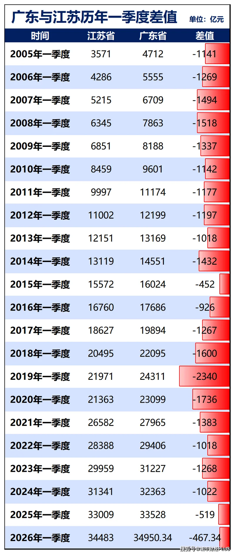 今年一季度,江苏增量继续第一,一季度差距更是缩小至新世纪以来第一季度差值最小。
