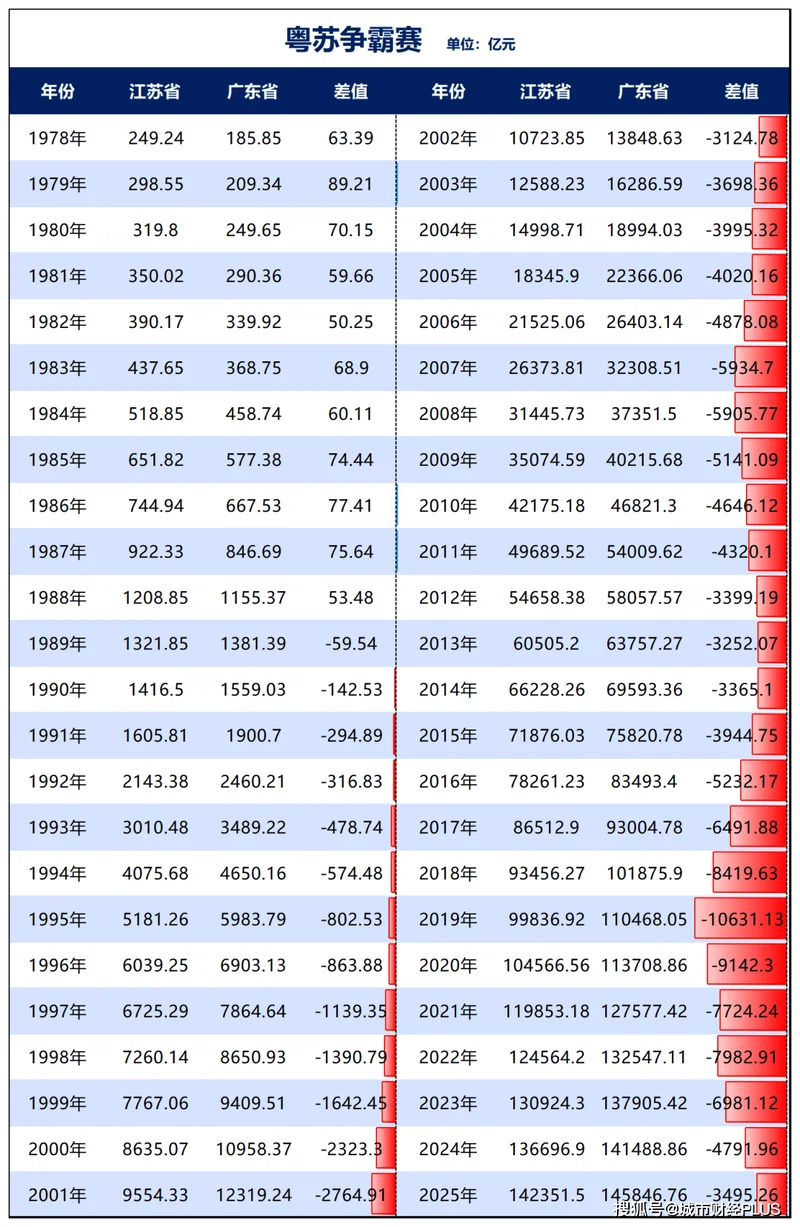 这是一场漫长的角逐,粤苏两省竞逐了几十年,广东第一、江苏第二的格局也保持了几十年。