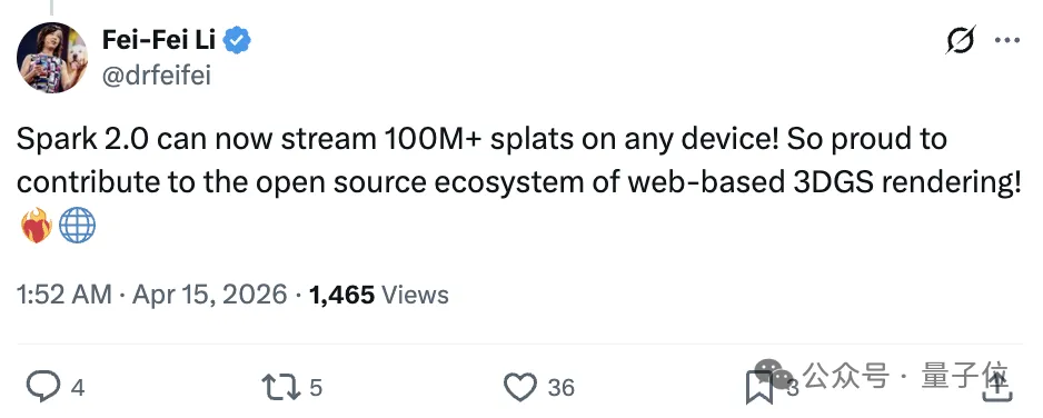 最近,AI教母李飞飞发帖宣布“可以在任意设备上流式传输超过1亿个高斯泼溅”。
