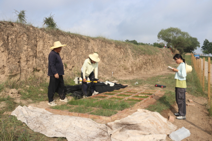 研究团队在通渭战国秦长城附近进行生物结皮试验。受访者供图。