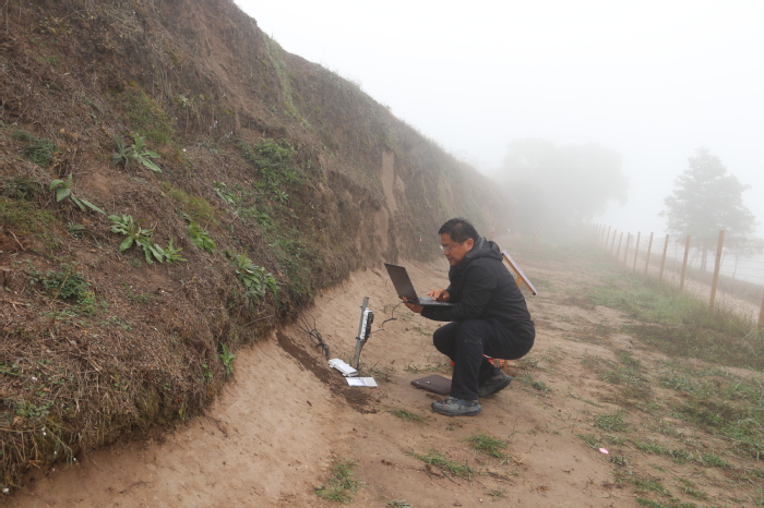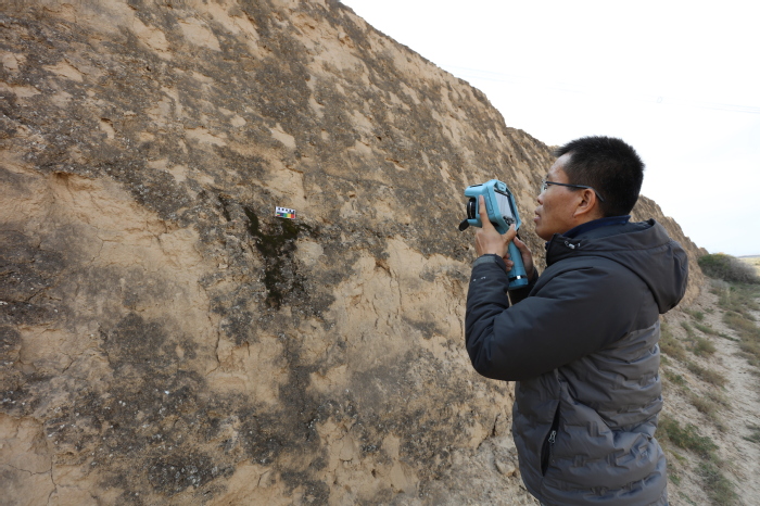 贾荣亮研究员在通渭战国秦长城采集监测数据。受访者供图。