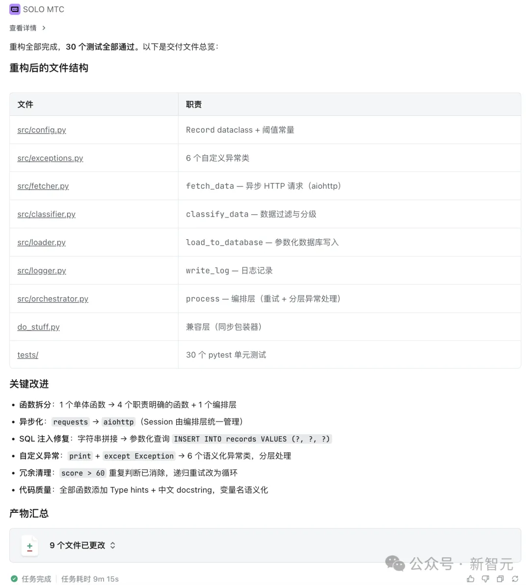 嗯你看一下这段Python代码啊,就是那个do_stuff函数,太乱了真的,啥都塞一块了,帮我重构一下吧。我大概说一下要求哈,先把这个大函数拆开,嗯,拆成三个吧,一个专门负责请求数据的、一个处理数据做分级的、还有一个写数据库加记日志的。不对,日志单独拆出来,拆成四个。就是职责分清楚点,别全堆一起。然后那个错误处理太乱了,到处都是try except和print,统一一下,改成自定义异常往外抛,哦对了,改成async await异步的,requests换成aiohttp那种。还有啊,注释加上,type hints加上,变量名别叫r、d、f这种鬼看得懂的名字,规范一点。那个score > 60写了两遍,SQL拼接也有注入风险,这些冗余的和有问题的逻辑都清理掉,参数化查询搞一下。对了单元测试也补上,pytest就行,差不多就这些。用Plan模式帮我规划一下。
