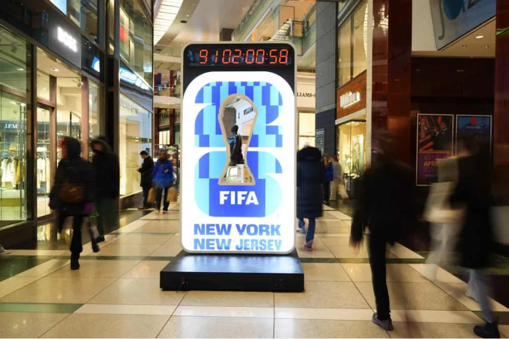 美国纽约曼哈顿一商业中心的世界杯倒计时牌图/中新图片中新社记者廖攀摄