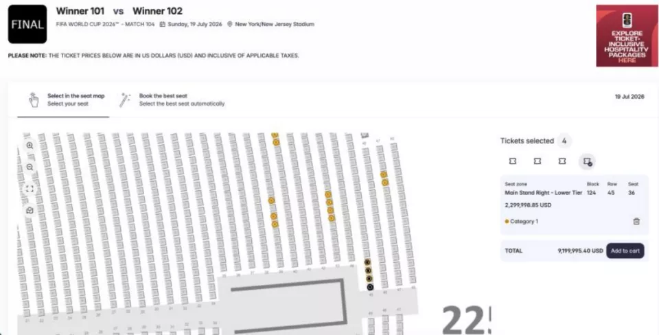 4月24日,国际足联官方门票转售平台出现了4张2026年美加墨世界杯决赛的门票,每张球票出售标价高达令人咋舌的近230万美元。
