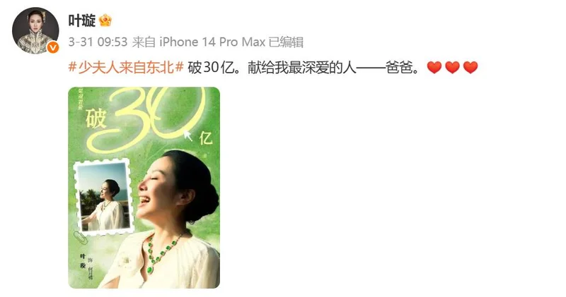 近日,叶璇也闯入短剧赛道,参演的《少夫人来自东北》拿下观看量破30亿、热度值破亿的好成绩。叶璇发文:献给我最深爱的人——爸爸。