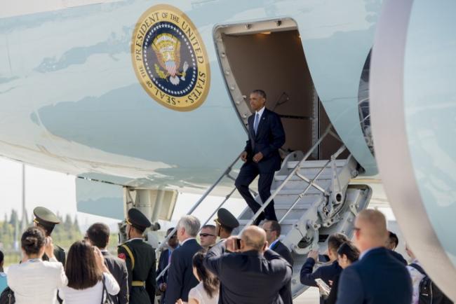 2016年访华期间,由于铺着红地毯的舷梯安排出现差错,巴拉克・奥巴马使用了空军一号自带的内置舷梯。图片来源:SAUL LOEB/AGENCE FRANCE-PRESSE/GETTY IMAGES