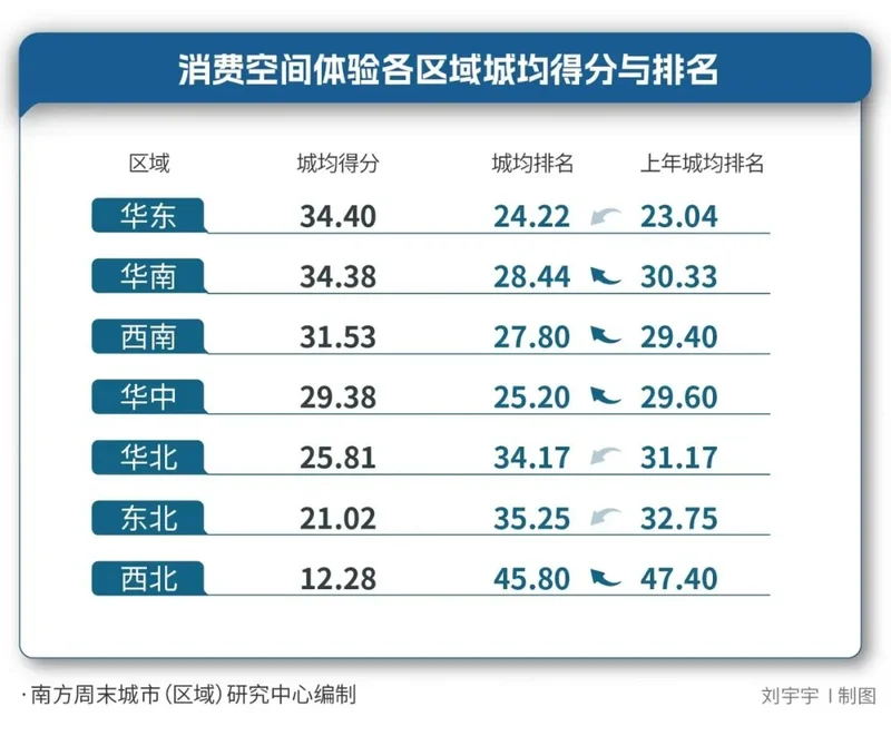 西南依托成都、重庆双核驱动,位居第三,商圈体量优势突出;华中平均排名靠前且提升幅度居各区域首位,内部均衡性与改善速度亮眼。华北以京津为核心支撑,城均得分位列第五。东北、西北整体仍处于追赶阶段,其中西北平均排名小幅提升,呈现低位缓增的态势。