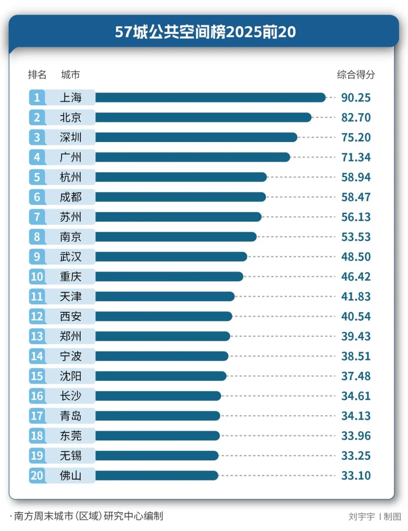 从综合得分来看,2025年的中国公共空间体验榜单呈现出强烈的“马太效应”和激烈的局部洗牌。资源的虹吸效应依然存在,但在具体的体验获得感上,老牌城市的护城河并非牢不可破。