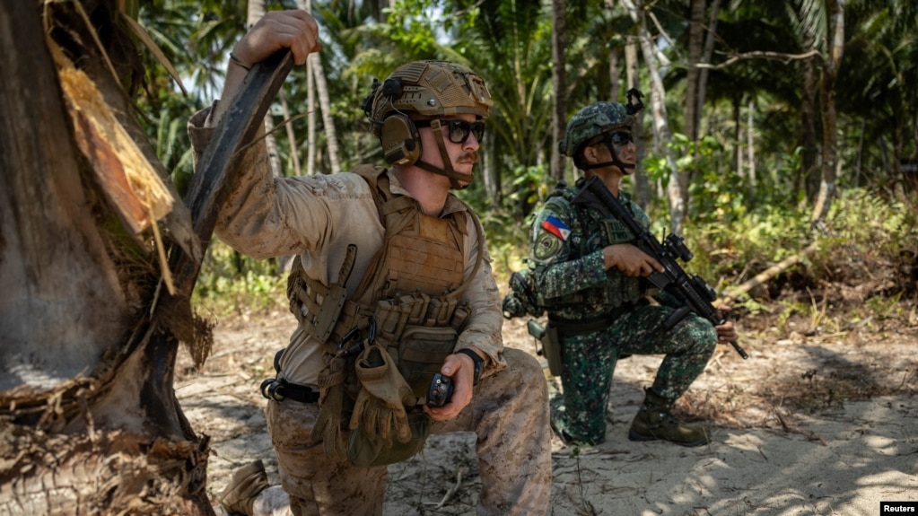 美国与菲律宾以及澳大利亚和新西兰的军队星期一(4月27日)在菲律宾的巴拉望岛海岸进行了反登陆实弹演练,这是2026年度“肩并肩”(Balikatan)军演的一部分。