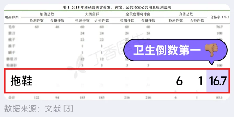 一项针对床单、口杯、浴巾、马桶盖、共用拖鞋、毛巾等 11 项公共用具卫生状况的调查显示,公用拖鞋的合格率最低,只有 16.7%。[3]