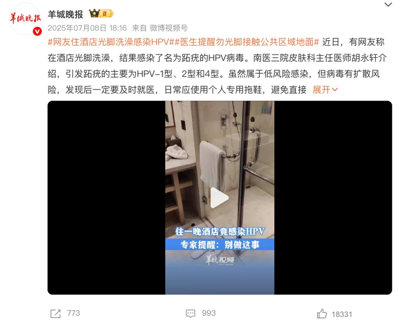 跖疣由 HPV 病毒引起,可在潮湿地面长期存活,通过皮肤微小伤口入侵。此前就有热搜新闻:有人因在酒店光脚洗脚、洗澡,结果感染跖疣,痛苦不堪👇