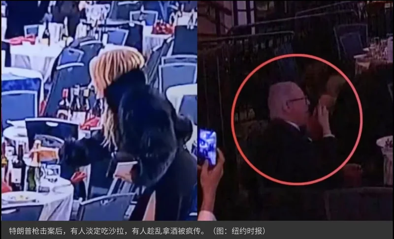 在网络上流传的视频显示,在枪击案现场,美国总统特朗普紧急撤离、全场嘉宾四处藏身,而格兰茨拒绝趴在地上避险,而是平静地继续享用沙拉。