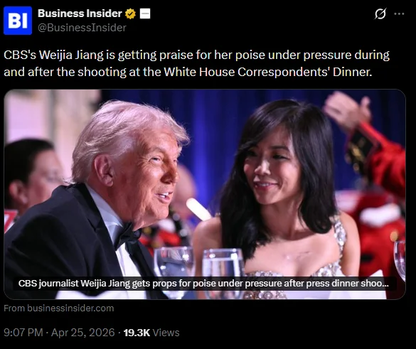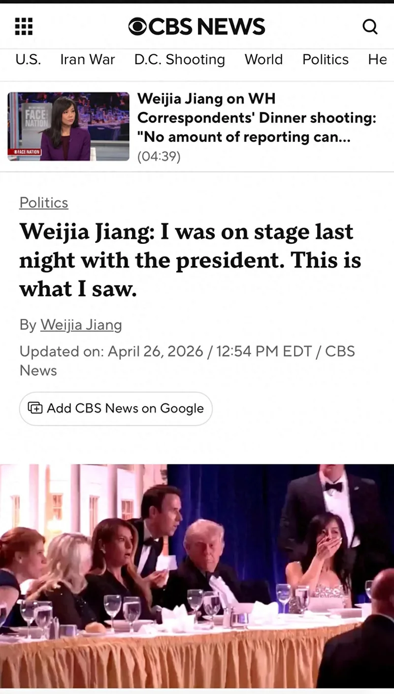 美国哥伦比亚公司新闻(CBS News)官网4月26日刊登蒋维佳的采访文录,她回忆了白宫记协晚宴枪击事件亲历的细节。报道的原标题是《Weijia Jiang: I was on stage last night with the president. This is what I saw.》(蒋维佳:昨晚我和总统一起站在台上。这是我所看到的)。