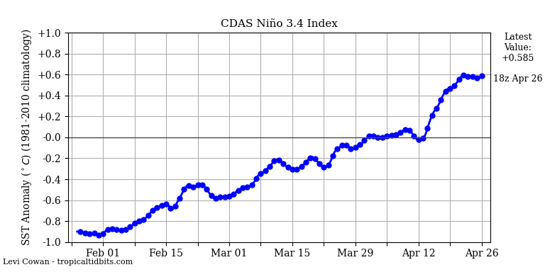 Nino 3.4 的温度异常已超过 0.5℃的重要界限(图片来源:CDAS)