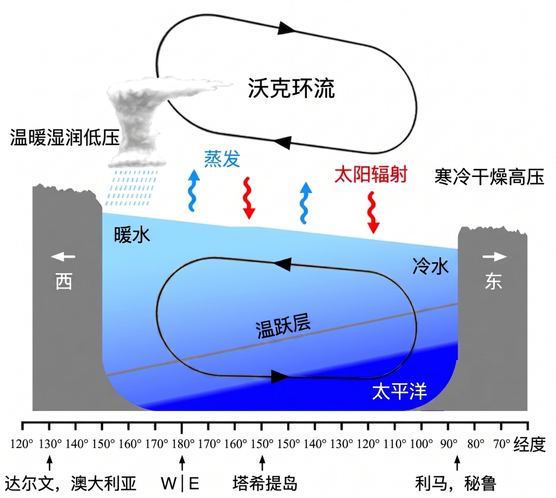 正常情况下,受地转偏向力等因素影响,赤道附近常年盛行偏东风,称为信风。信风将太平洋表层的温暖海水不断向西输送。因此,西太平洋就变成了 “温水池”,海平面比东边高出几十厘米;东太平洋的表层海水被吹去西边,深层的较冷海水就会上翻补充,形成 “冷水池”。如此一来,整个太平洋形成了 “东冷西热” 的局面。