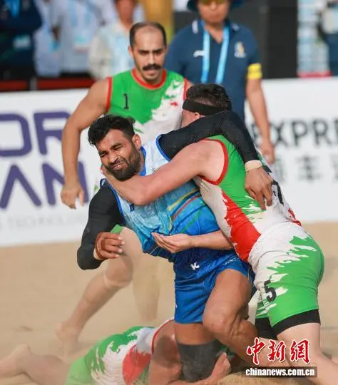 4月27日,在海南三亚举行的第六届亚洲沙滩运动会沙滩卡巴迪男子决赛中,伊朗队(绿衣)以44比31击败印度队夺得金牌。图为双方在比赛中。中新网记者 贾天勇 摄