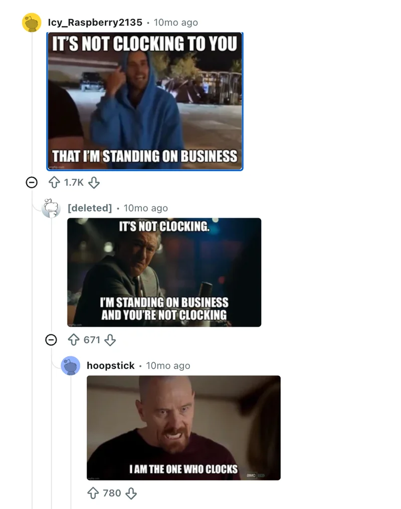 中文对标: 大概是“看穿”“点破”“真相了”这种。但“clock it”多了一层“我早就知道了/我注意到了”的dramatic效果。有点像是中文网络梗里“啊对对对”的反向变形——用阴阳怪气的语气形容一个事实。