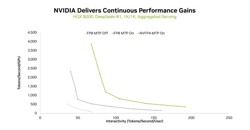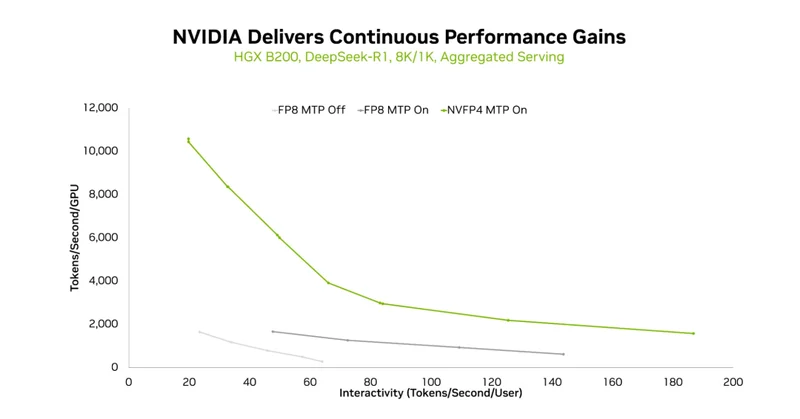 结合TensorRT-LLM与TensorRT Model Optimizer的全栈支持,HGX B200在保持精度的前提下,吞吐曲线随MTP+NVFP4的启用持续右移——意味着在相同交互性下能服务更多用户,或在相同用户数下提供更流畅的体验。