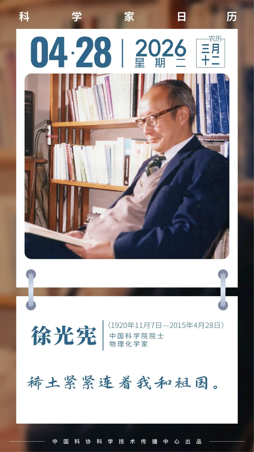 徐光宪(1920年11月7日—2015年4月28日),中国共产党优秀党员,物理化学家、无机化学家,中国科学院院士。