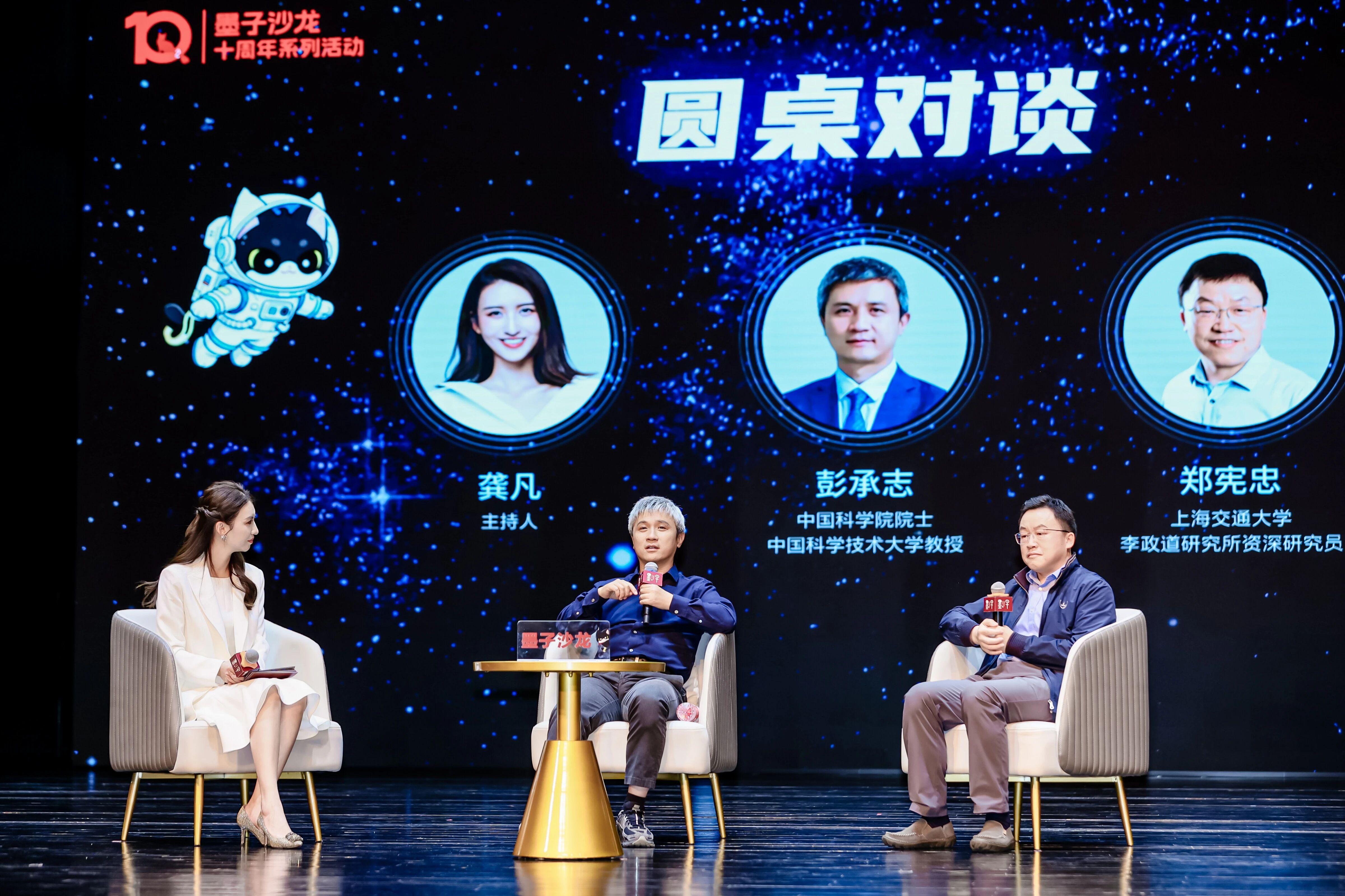 在随后的圆桌对话环节,中国科学学院院士、中国科学技术大学杰出讲席教授彭承志与上海交通大学李政道研究所资深研究员、JUST项目建设委员会主任郑宪忠就量子通信与天文观测的结合、量子科技的未来、从事科学研究行业的契机等问题展开对谈。